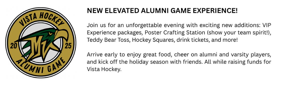 Join us for an exciting evening of hockey and camaraderie at the 6th Annual Vista Hockey Alumni Game! We’re thrilled to welcome back all alumni to hit the ice once again. Mark your calendars for November 29, 2025 from 5:30-7:30 pm at the South Suburban Sports Complex.